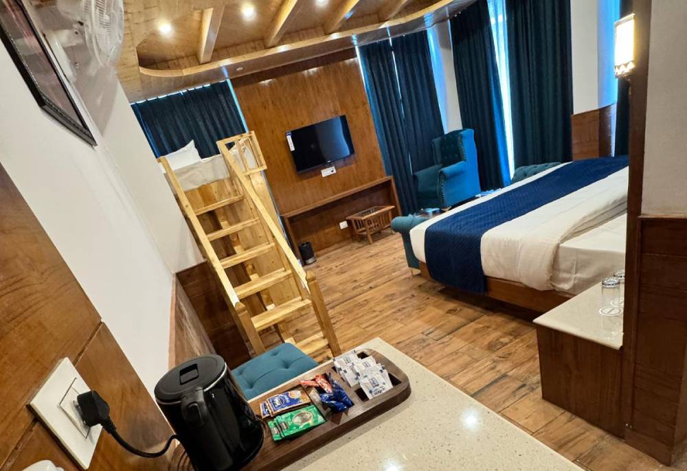 The Family Suite Room is a spacious haven ideal for families or groups. Featuring multiple beds, a sitting area, and well-planned interiors, it ensures both comfort and privacy. Equipped with a flat-screen TV, electric kettle, Wi-Fi, and daily housekeeping, it creates a homely atmosphere for relaxing after a day of sightseeing in Manali’s beautiful surroundings.